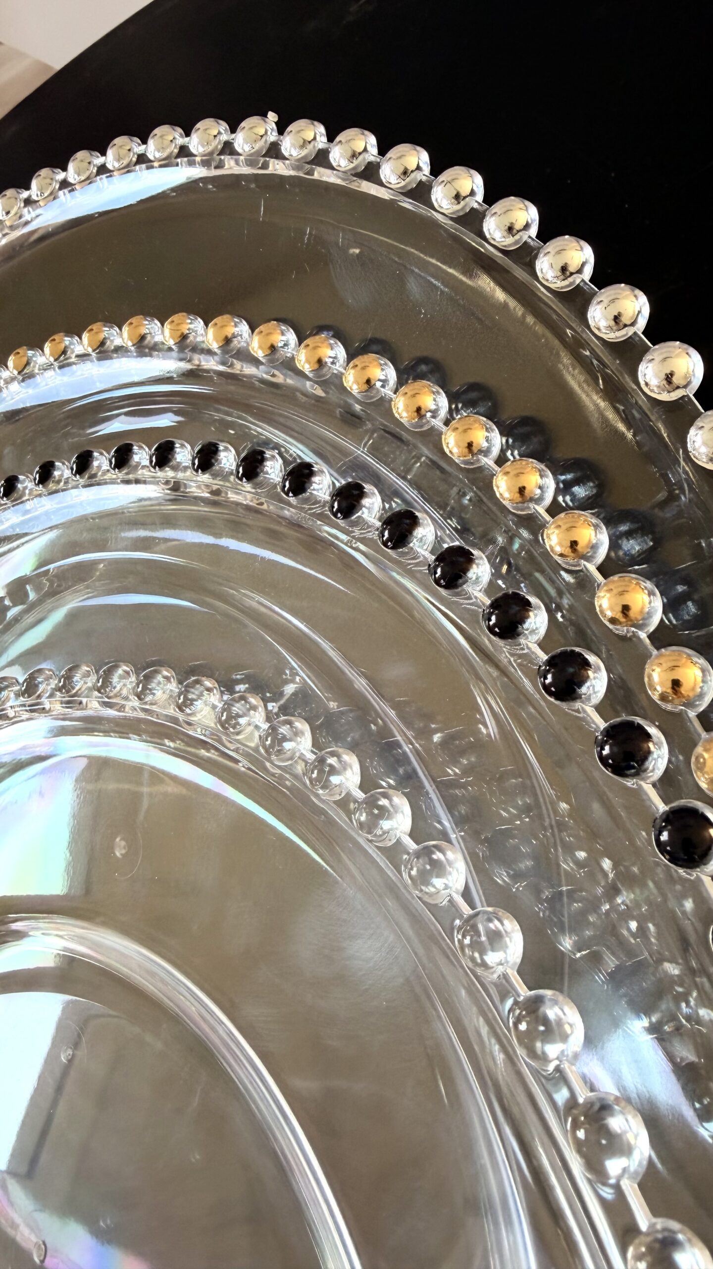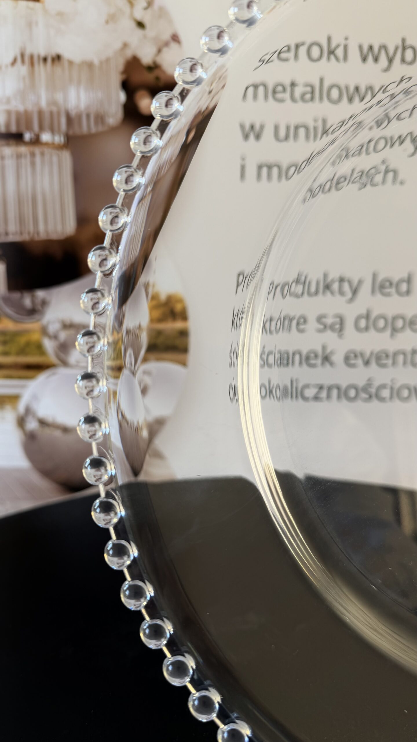 Plastikowy podtalerz w nowoczesnym stylu z transparentnymi kulkami, to efektowny, a zarazem praktyczny dodatek do nakrycia stołu.