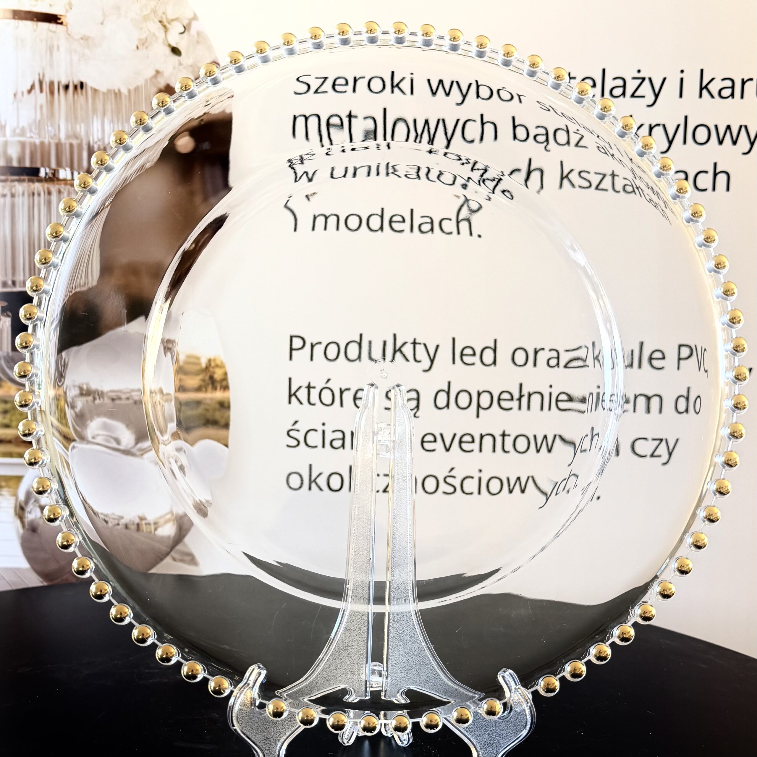 Podtalerz PLASTIKOWY transparentny 33 cm ze ZŁOTYMI kulkami
