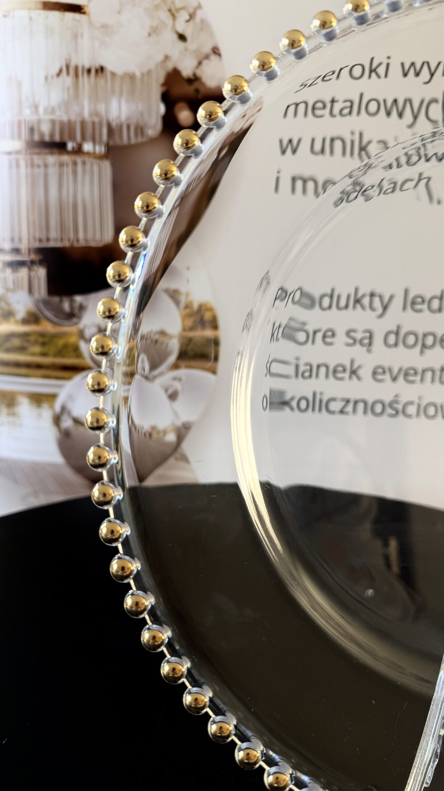 PLASTIKOWY PODTALERZ TRANSPARENTNY Z ZŁOTYMI KULKAMI