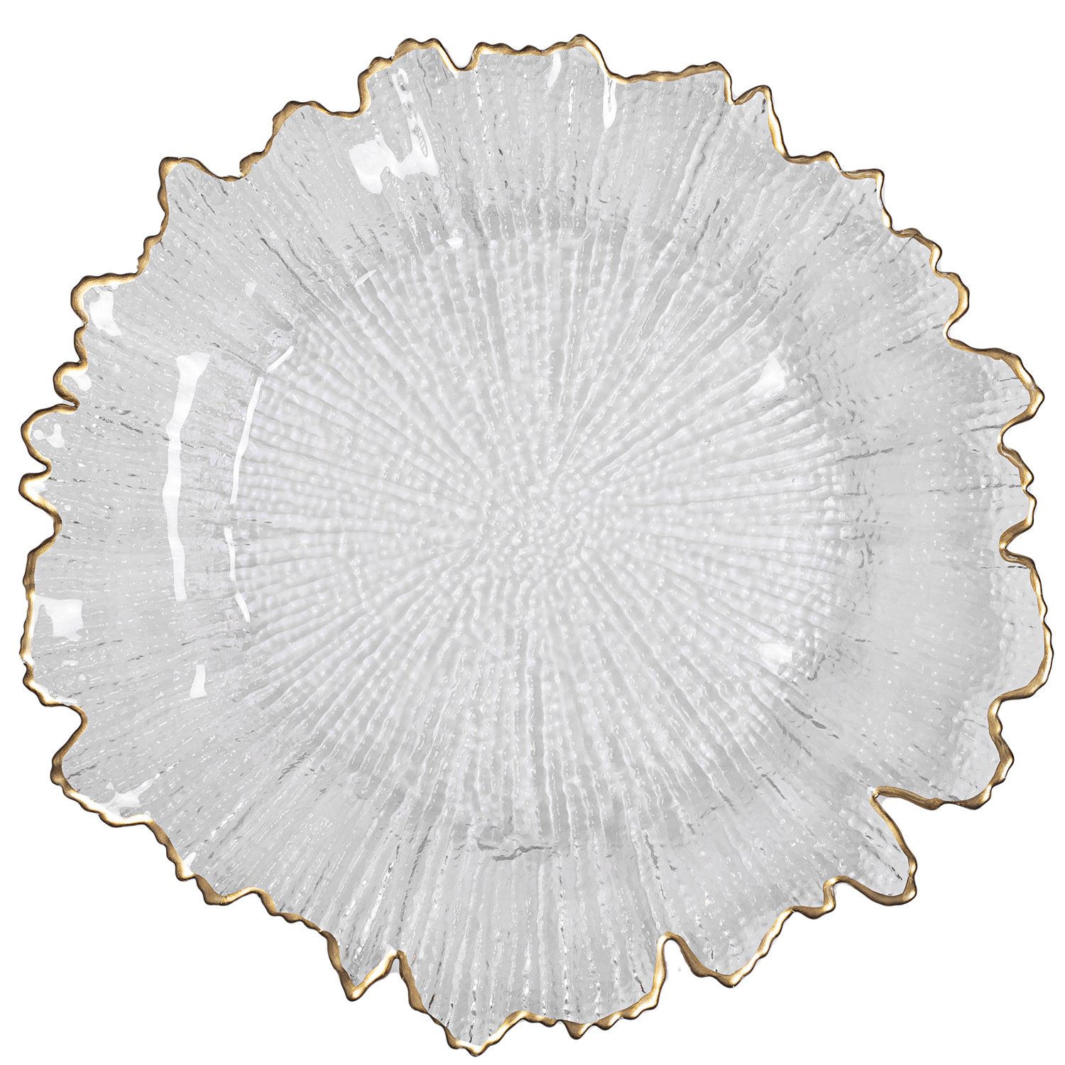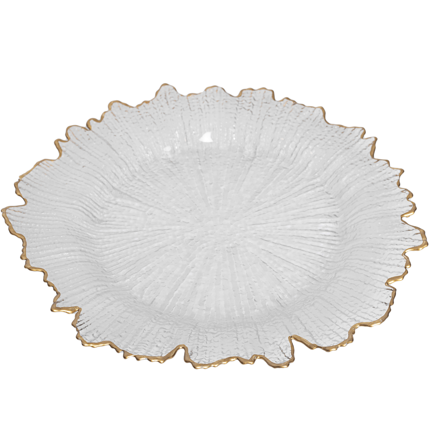 Podtalerz w tym wzorze łączy w sobie prostotę i dekoracyjność – pasuje zarówno do bardzo wytwornych aranżacji, jak i bardziej naturalnych, swobodnych stylizacji. Podtalerz w całości jest przezroczysty, a na rancie posiada złote zdobienie.