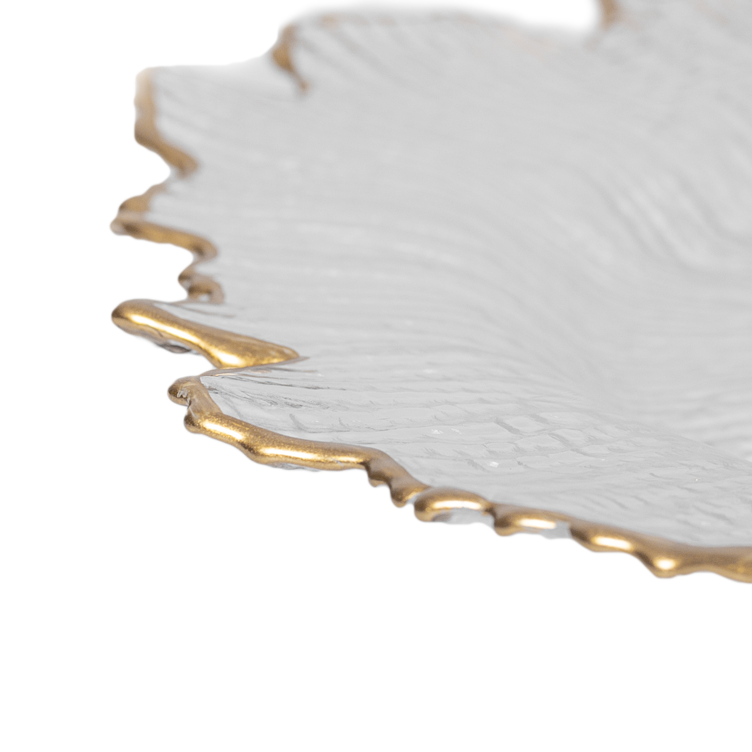 Szklany podtalerz w kształcie liścia ze złotym rantem – wyjątkowy akcent eleganckiego stołu