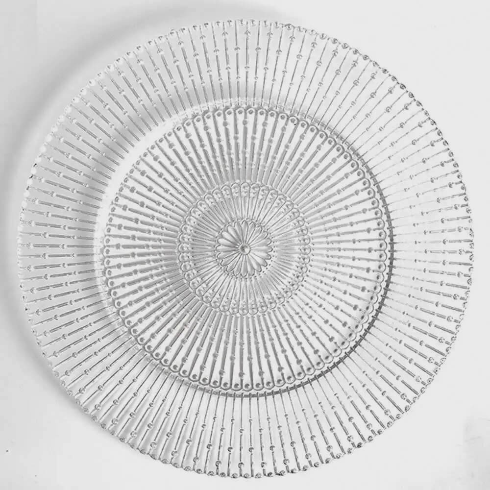Podtalerz szklany z karbowanym wzorem o średnicy 33 cm. Wykonany z najwyższej jakości szkła, dzięki czemu posłuży przez wiele sezonów. Okrągły podtalerz w nieregularnym kształcie na obwodzie to elegancki dodatek na stoły. Jako podstawka pod zastawę stołową doda każdej dekoracji okolicznościowej unikatowości. Podtalerze znalazły świetne zastosowanie głównie w dekoracjach ślubnych, a dostępność ich w różnych modelach pozwala na dopasowanie do różnych stylów dekoracyjnych. Stosowany może być również w domowych czy biurowych wnętrzach jako podstawka pod świece, kwiaty czy różnego rodzaju dekoracje.
