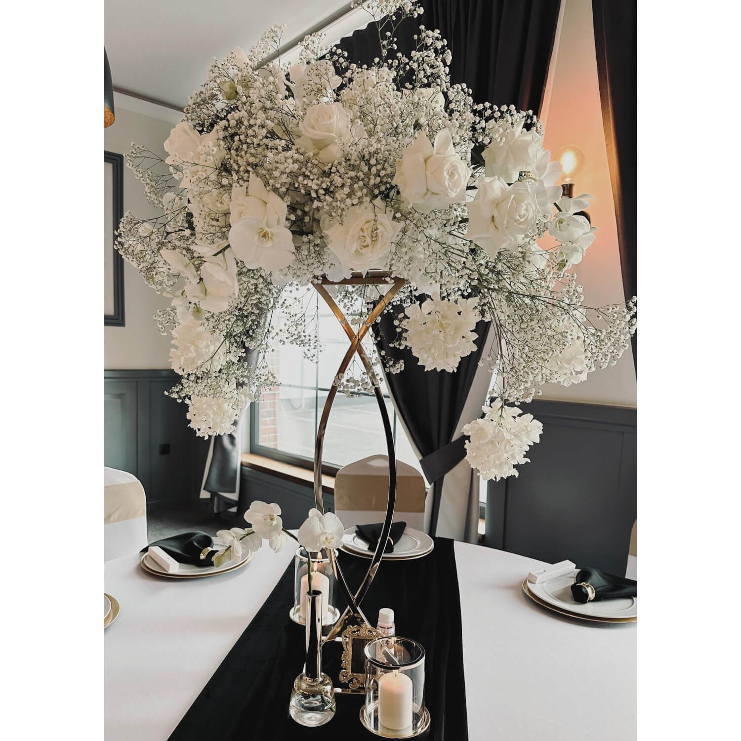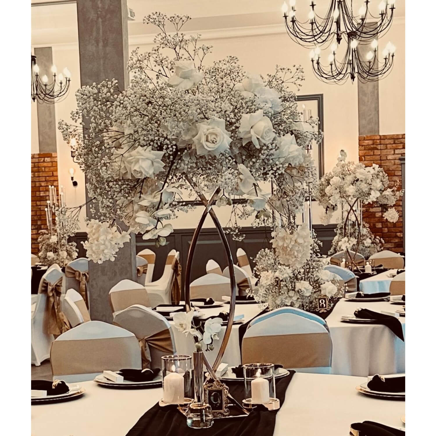 Stojak metalowy “łezka” w kolorze lustrzanego złota, to nowość wśród stojaków geometrycznych. Eleganckie złoto pozwala na wkomponowanie stojaka w różne style dekoracyjne wśród realizacji weselnych.