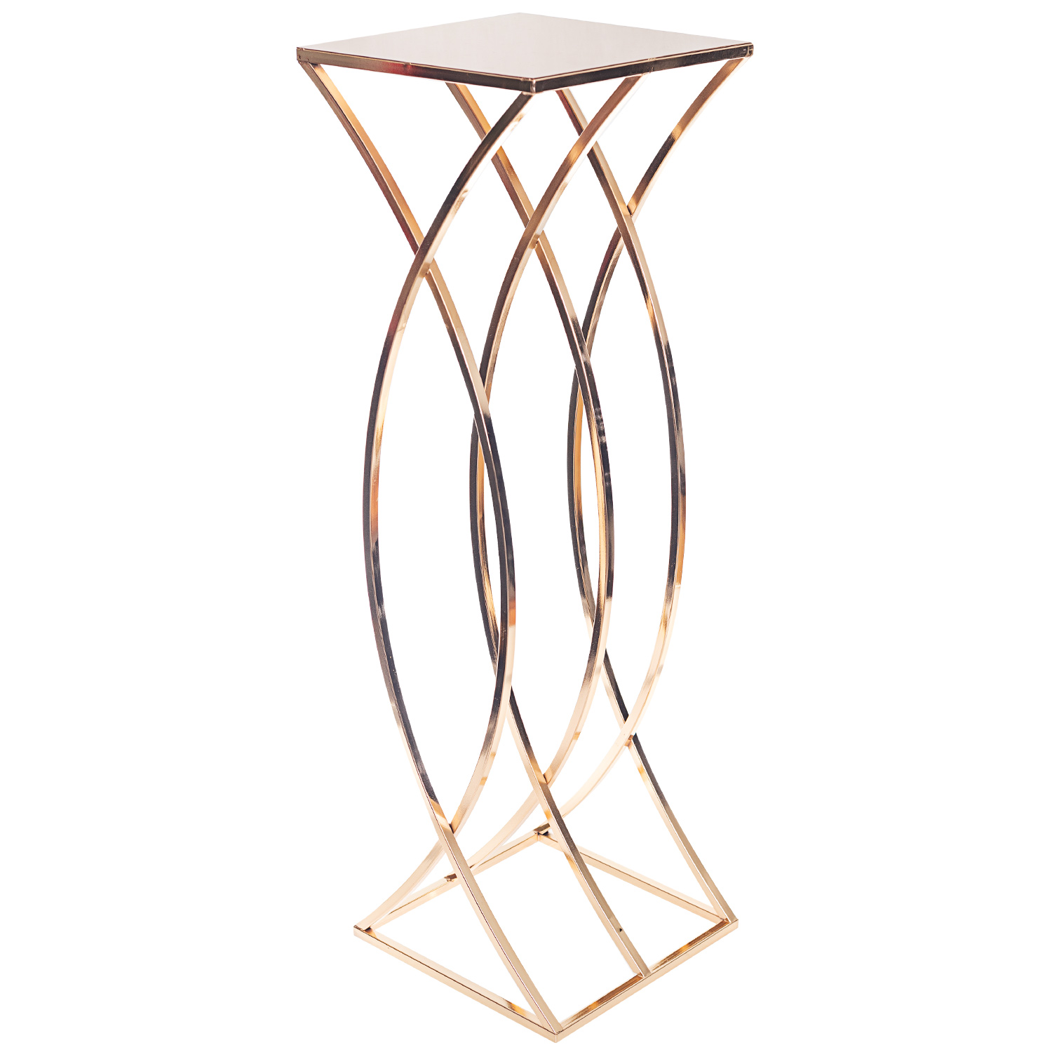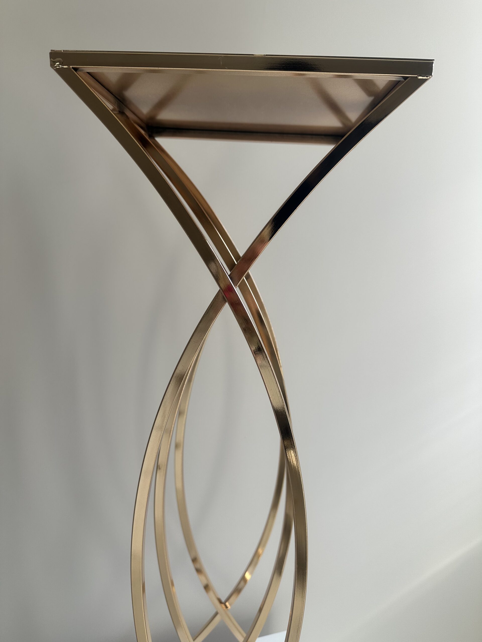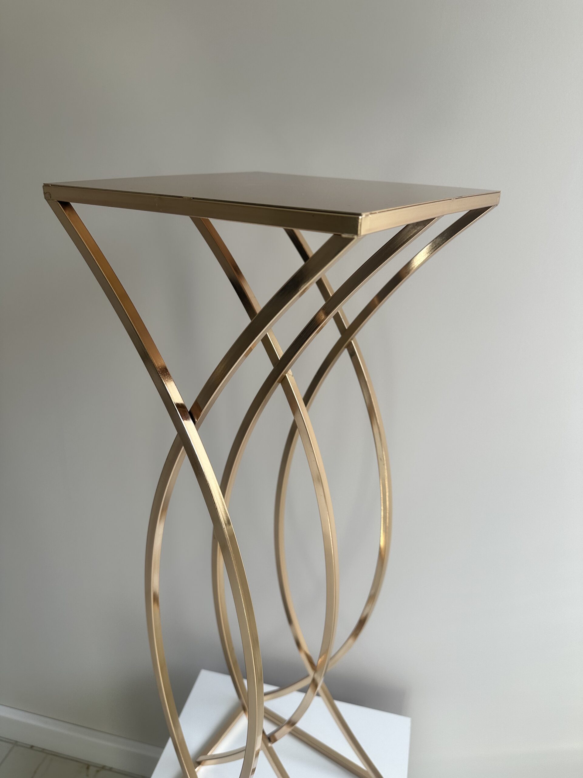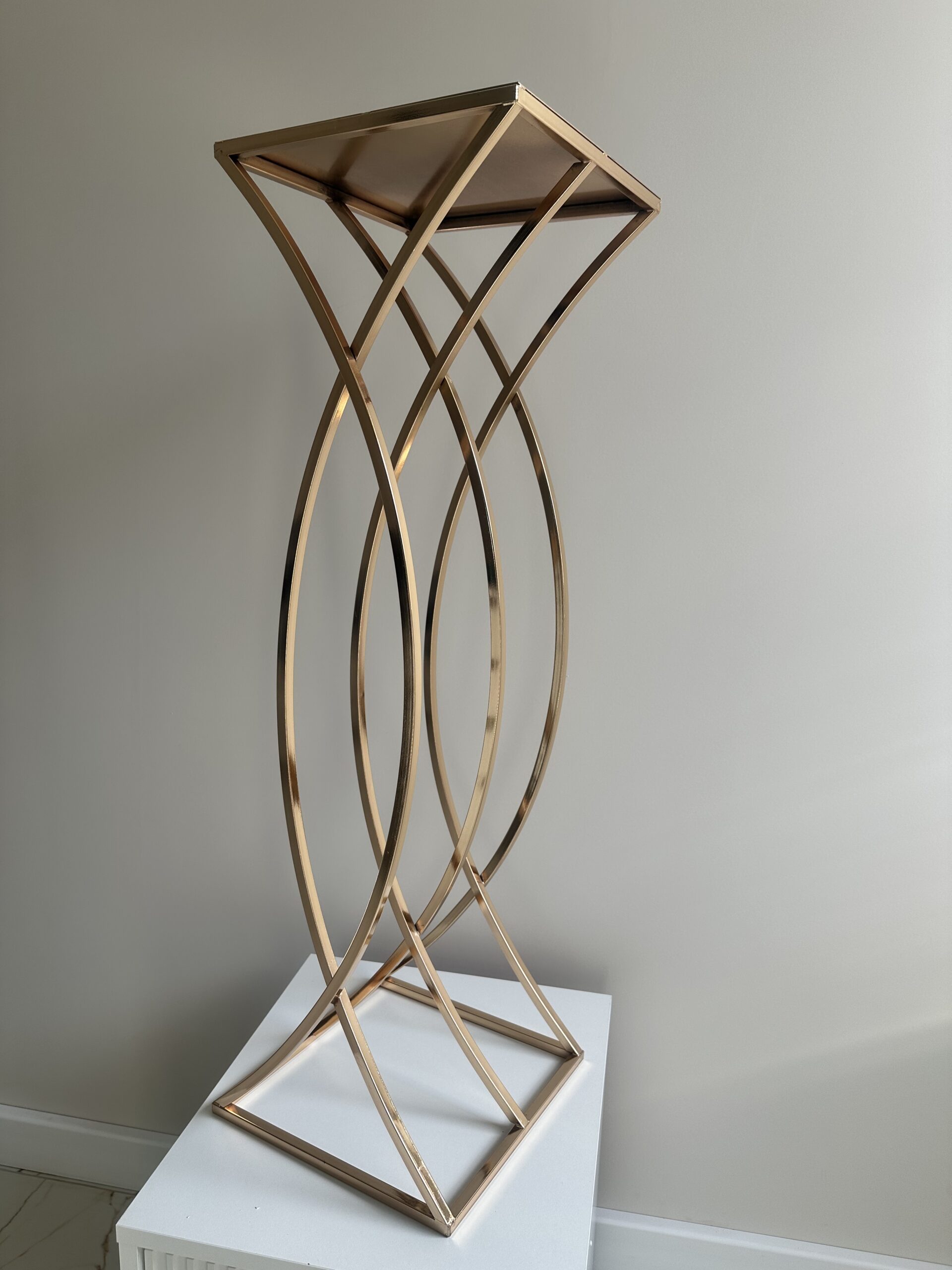 Eleganckie złoto pozwala na wkomponowanie stojaka w różne style dekoracyjne wśród realizacji weselnych. Stojak posiada na górze półkę dzięki czemu o wiele łatwiejsze i stabilniejsze jest umieszczenie na nim kompozycji kwiatowych.