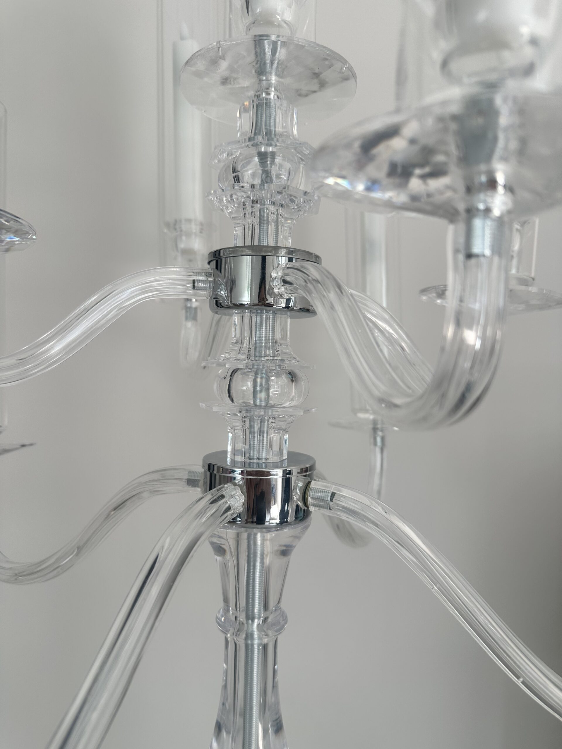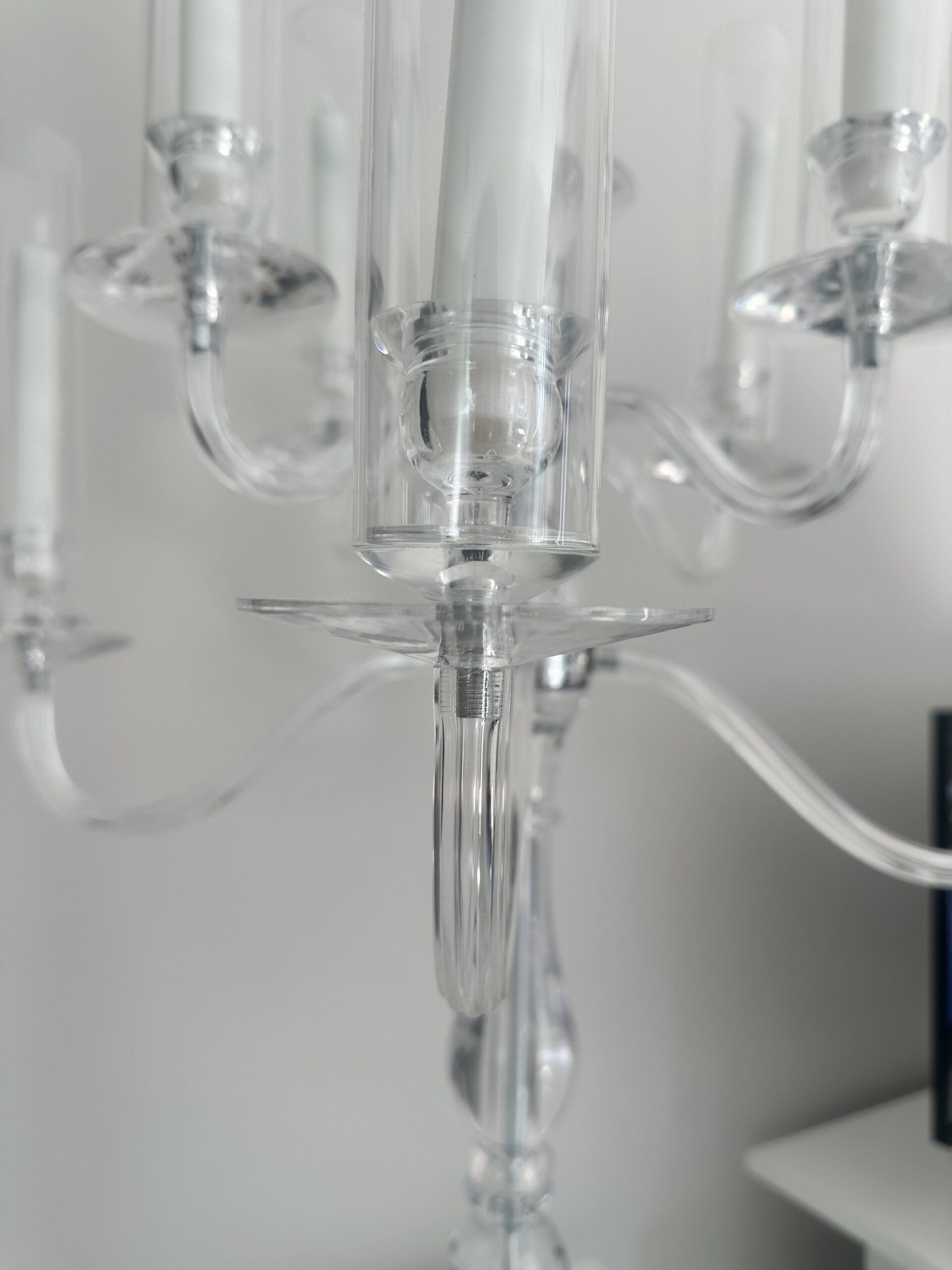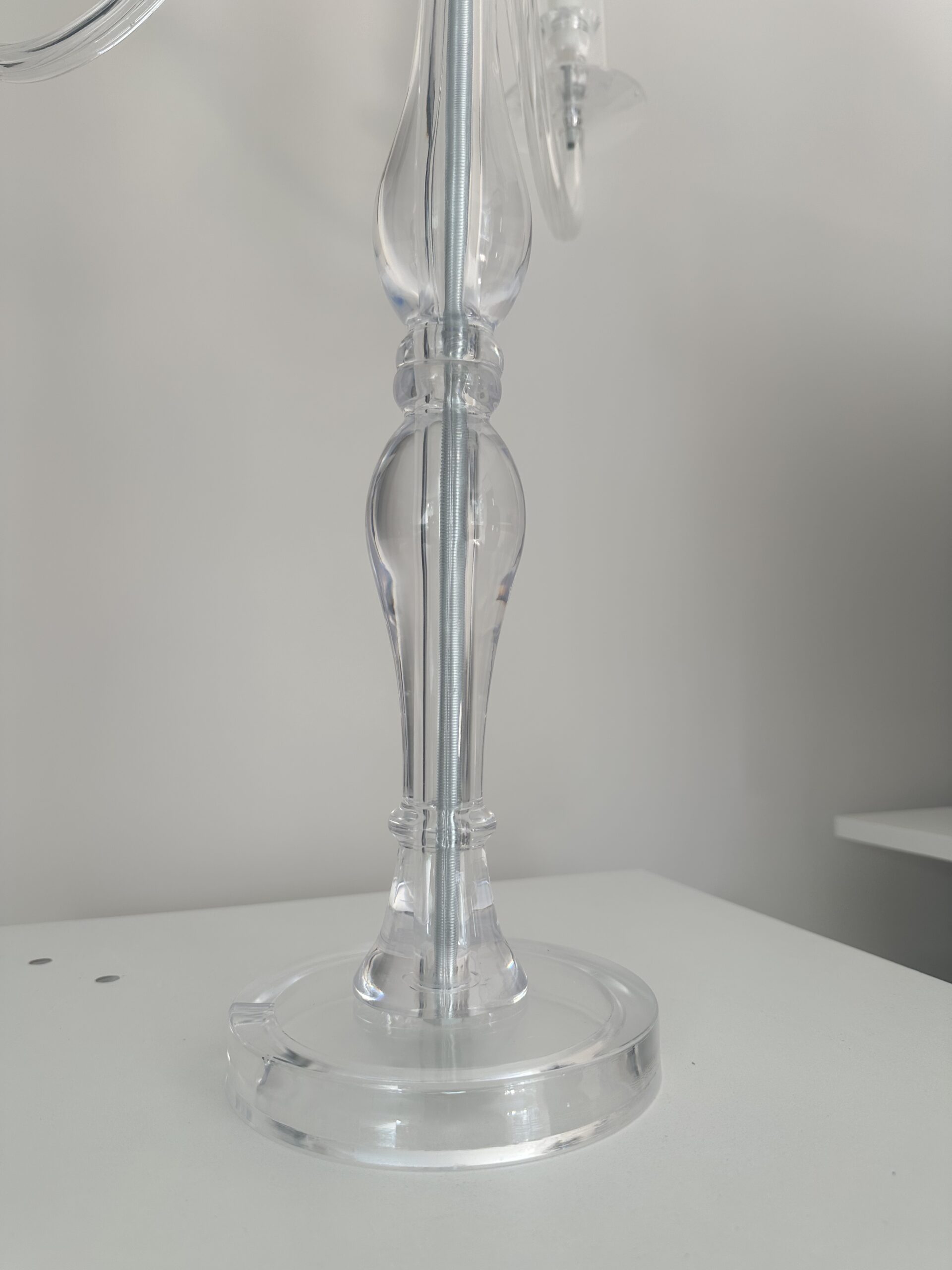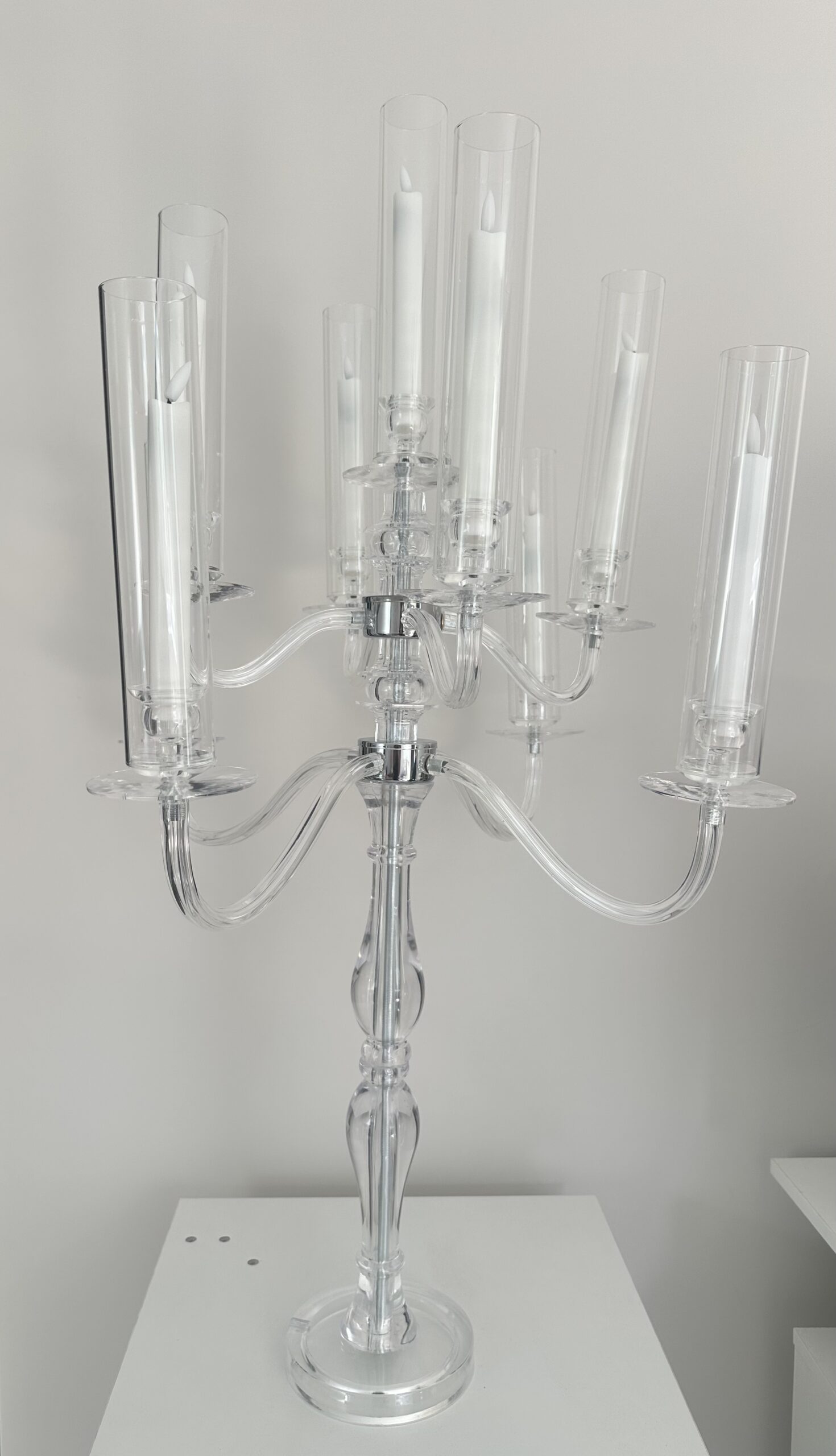 Stabilna okrągła podstawa o średnicy 15 cm, na niej umieszczony trzon całego kandelabru, co ważne w środku wypełniony również akrylem, a dodatkowo wzmocniony metalową śrubą. Zapewnia to niesamowitą stabilność świecznika i zapobiega jego przechyleniom czy wyginaniu się. 4 dłuższe ramiona umieszczone w pierwszym rzędzie oraz 4 krótsze umieszczone na drugiej wysokości. W centralnej części świecznika umieszczone jest 9-te ramie. Na każde z ramion nakłada się okrągłe akrylowe podstawki, a następnie na nie przykręca podstawki na świeczki. Całość uzupełniają tuby szklane, które w wyjątkowo elegancki sposób odbijają światło ledowych świec.
