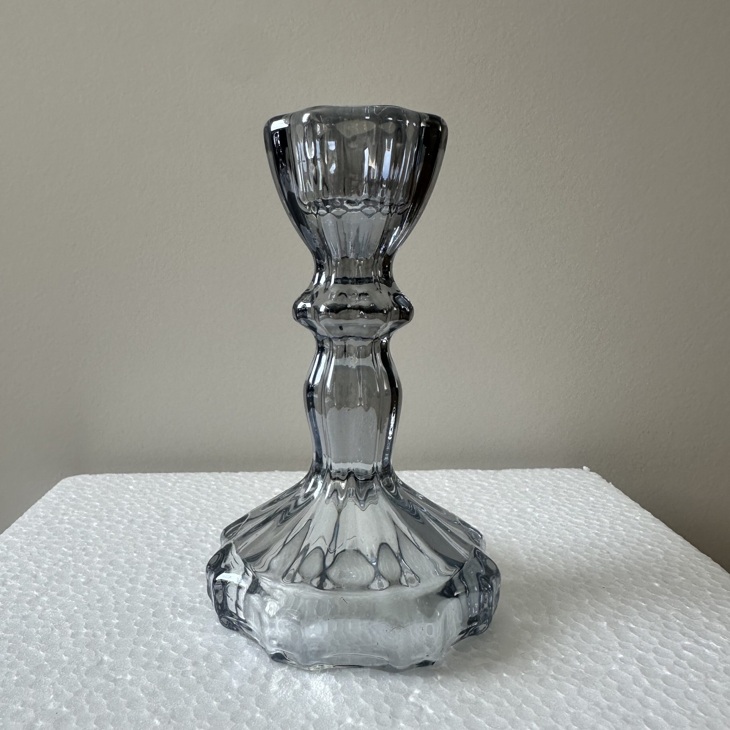 Świecznik szklany wykonany z ciemnego szkła.